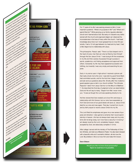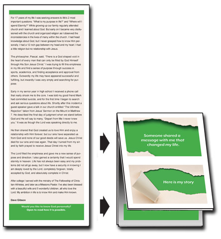 MyStory Gospel Tracts are an effective tool for sharing your Christian faith with others. It's different from all other tracts because it combines your own personal testimony with an illustrated explanation of the Gospel.